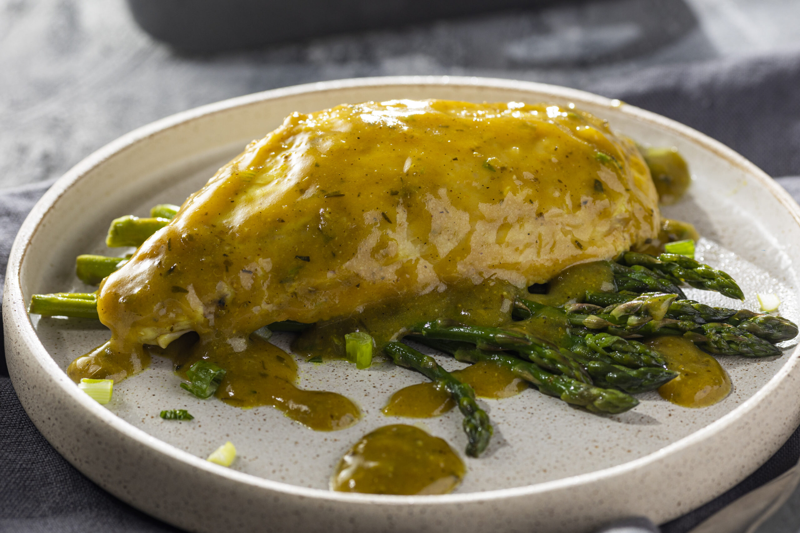 Σερβίρουμε σε πιάτο το κοτόπουλο με τα σπαράγγια και περιχύνουμε τη σάλτσα.