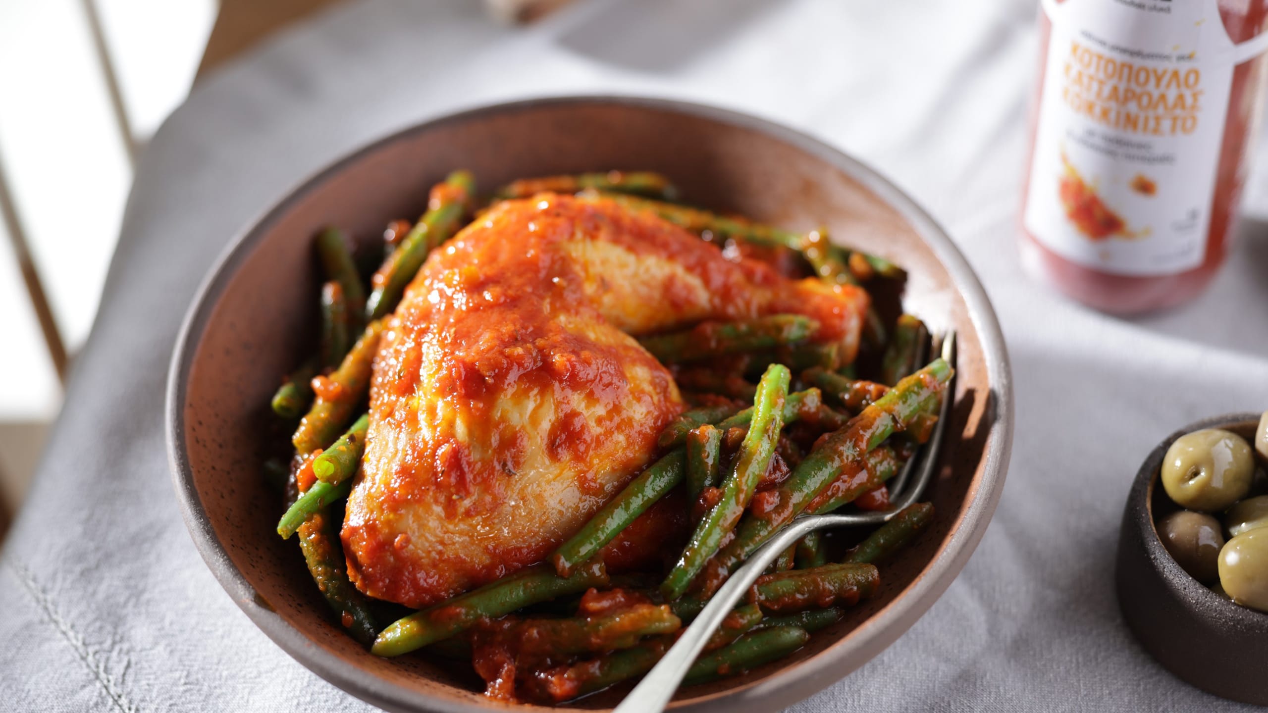 Μπουτάκια κοτόπουλου κοκκινιστά με φασολάκια